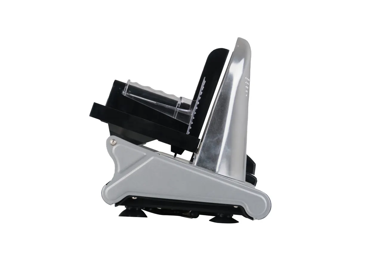 Все ключевые элементы слайсера изготовлены из нержавеющей стали, что облегчает чистку и предотвращает коррозию. Рекомендуется регулярно промывать устройство после работы, уделяя особое внимание ножу и местам соприкосновения с продуктом, чтобы избежать накопления остатков.