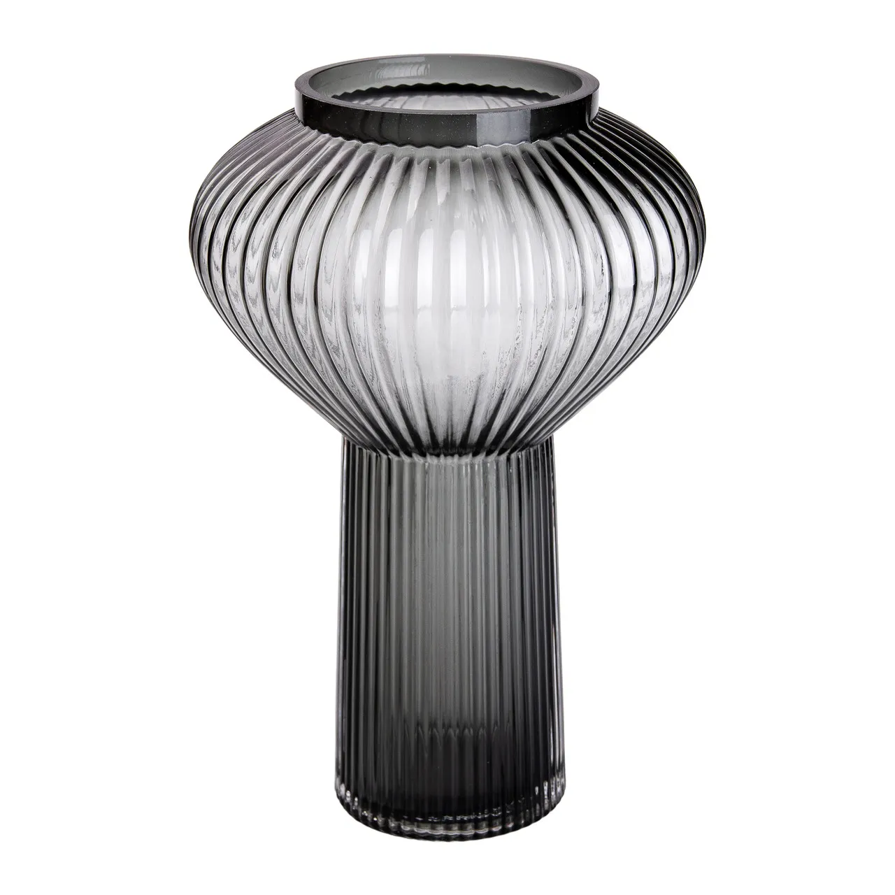 Материал вазы – высококачественное стекло, что обеспечивает не только эстетическую привлекательность, но и долговечность изделия. Высота вазы составляет 30 см, ширина – 19 см, диаметр горловины – 10.5 см. Цветовое решение реализовано в строгом сером оттенке, который легко сочетается с различными стилями интерьера.