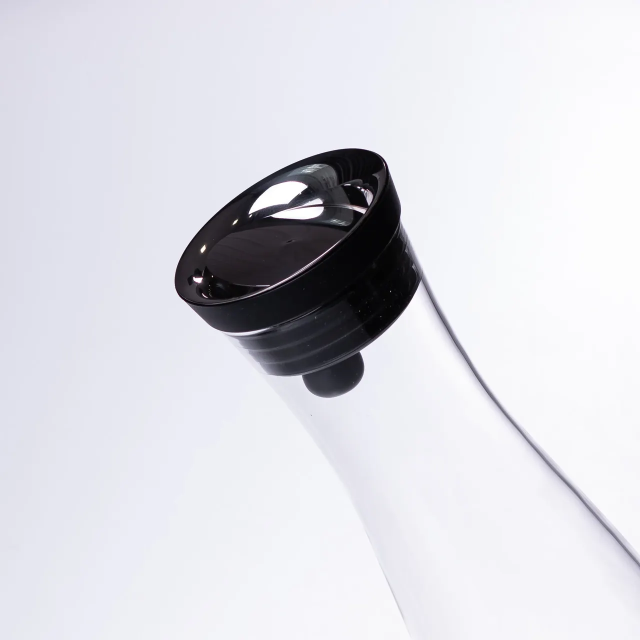 Особенностью данного графина является продуманная крышка с автоматическим механизмом открытия и закрытия, которая обеспечивает надежную защиту напитка от пыли и насекомых. Внутри крышки встроено съемное ситечко, предотвращающее попадание льда, фруктовых долек или трав в налитый напиток. Это повышает удобство при использовании, особенно при подаче лимонадов, холодных настоек или охлаждённого чая.