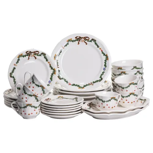 В составе набора – 32 предмета, рассчитанных на шесть человек. В комплект входят тарелки нескольких диаметров (26 см — обеденные, 21 см — суповые, 17 см — десертные и 14,5 см — блюдца), а также чайные чашки объемом 300 мл. Глубокие тарелки рассчитаны на 500 мл, что удобно для подачи первых блюд.