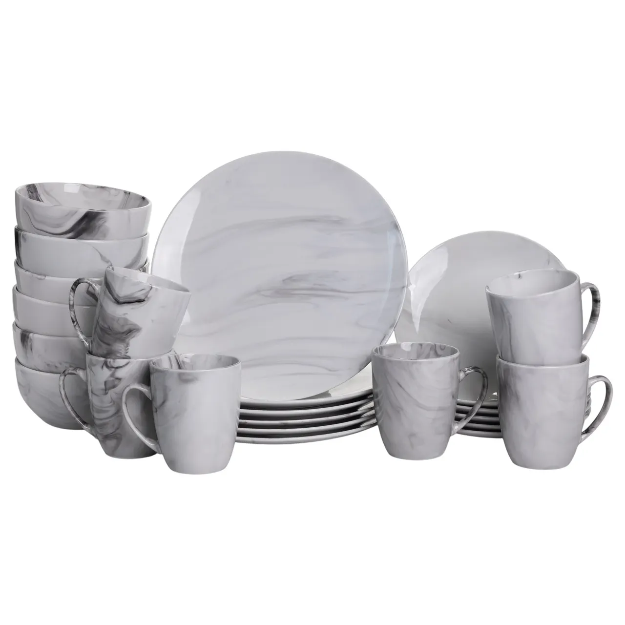 Изделия выполнены из высококачественного фарфора, что обеспечивает долговечность и практичность сервиза. Мраморный узор на поверхности придаёт набору изысканный и современный внешний вид, сочетая эстетику и функциональность.