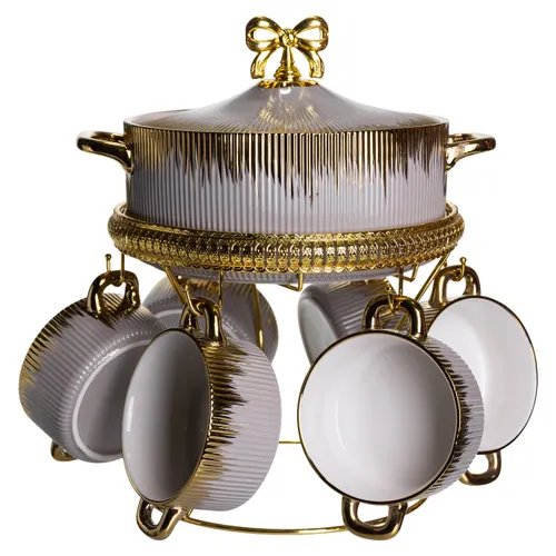 В отличие от стандартных наборов, модель FM-A23-6 привлекает внимание своим стильным сочетанием серого цвета и золотых деталей, придающих столу утонченность. Качественный фарфор гарантирует долговечность, а продуманная конструкция подставки обеспечивает комфорт при сервировке.