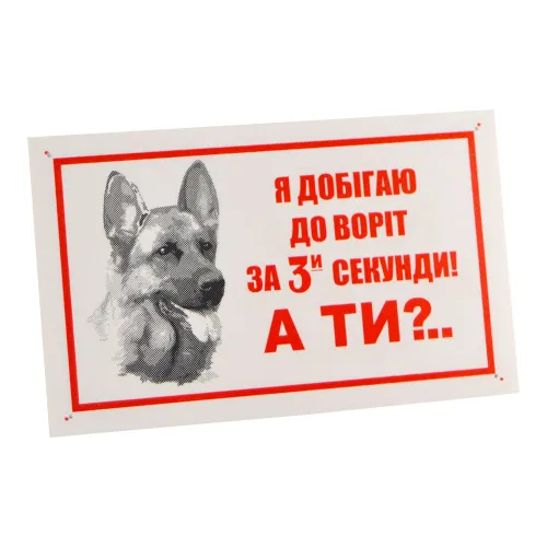 Табличка «Я добегаю до ворот...» изготовлена из высококачественного пластика и украшена фотографией немецкой овчарки, которая считается эталоном сторожевой собаки. Для улучшения эксплуатации изделие имеет отверстия для крепления с четырех сторон.