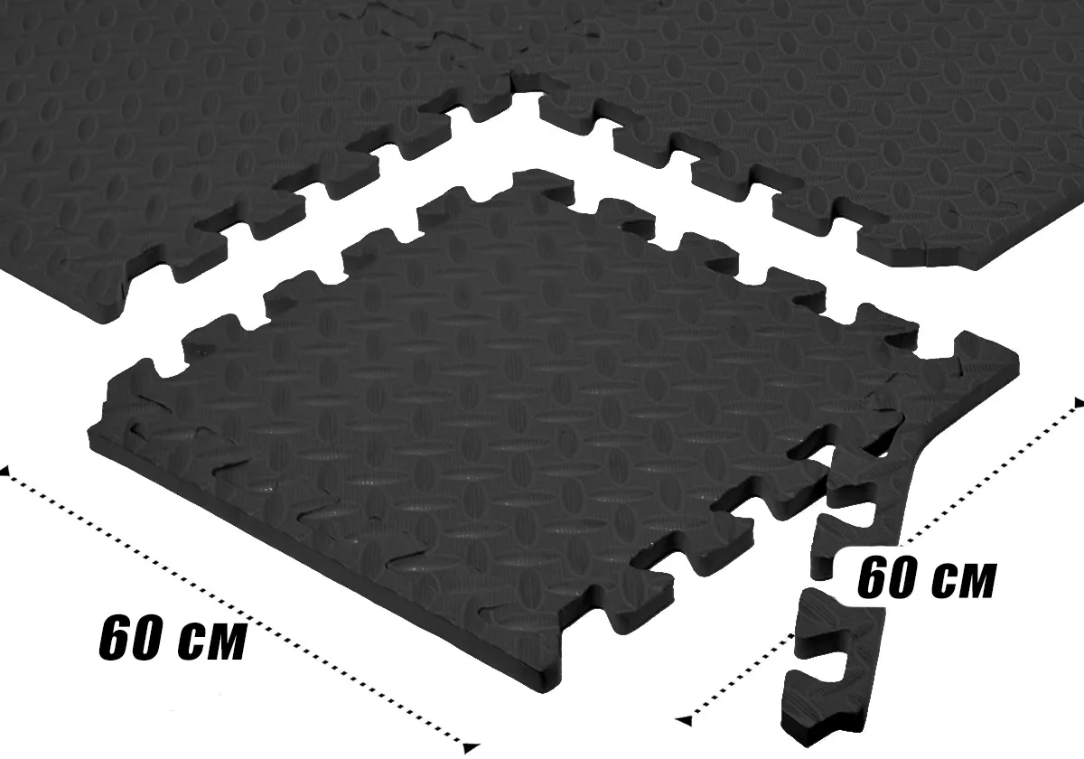 Розміри: 120 х 120 х 2 см. Матеріал: піноматеріал EVA. Комплектація включає 4 елементи розміром 60 х 60 см і 8 замикаючих планок.