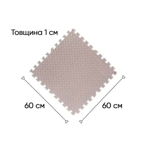 Размеры: 120х120х1 см. Материал: пеноматериал EVA. Комплектация: 4 элемента 60 х 60 см и 8 окончаний. Цвет: бежевый. Оттенок цвета изображения товара на фото может незначительно отличаться от фактического.
