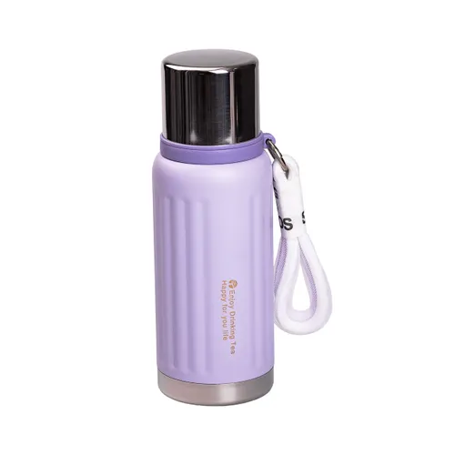 Сиреневый цвет термоса легко сочетается с различными аксессуарами для активного отдыха, подчеркивая индивидуальность владельца. Текстильный ремешок позволяет фиксировать изделие на рюкзаке или сумке, обеспечивая удобство и мобильность.