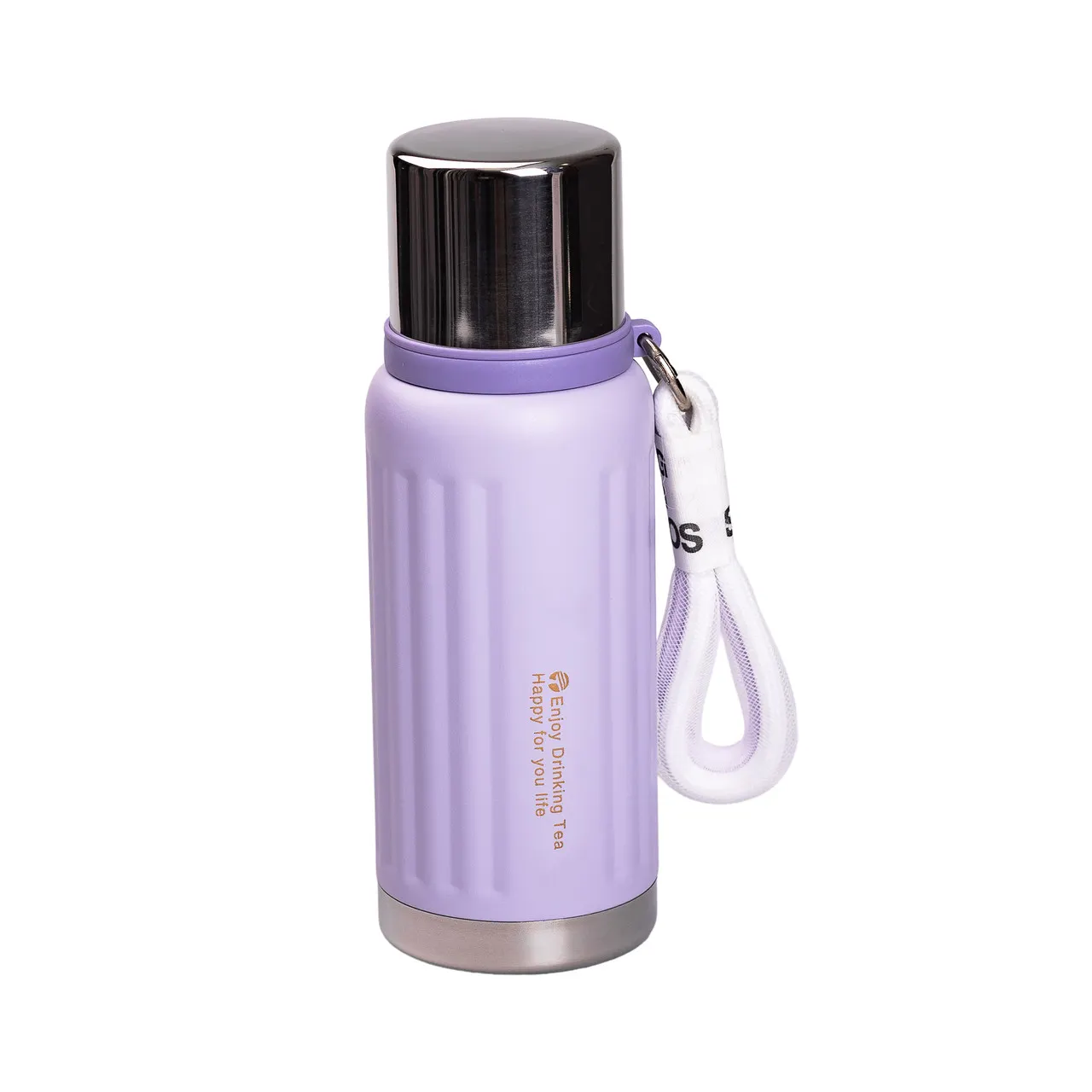 Цвет корпуса – насыщенный сиреневый, что придает термосу стильный и современный вид. Кроме того, к термосу прилагается текстильный ремешок с декоративной надписью, обеспечивающий удобство переноски и возможность крепления к аксессуарам для рук или плеч.