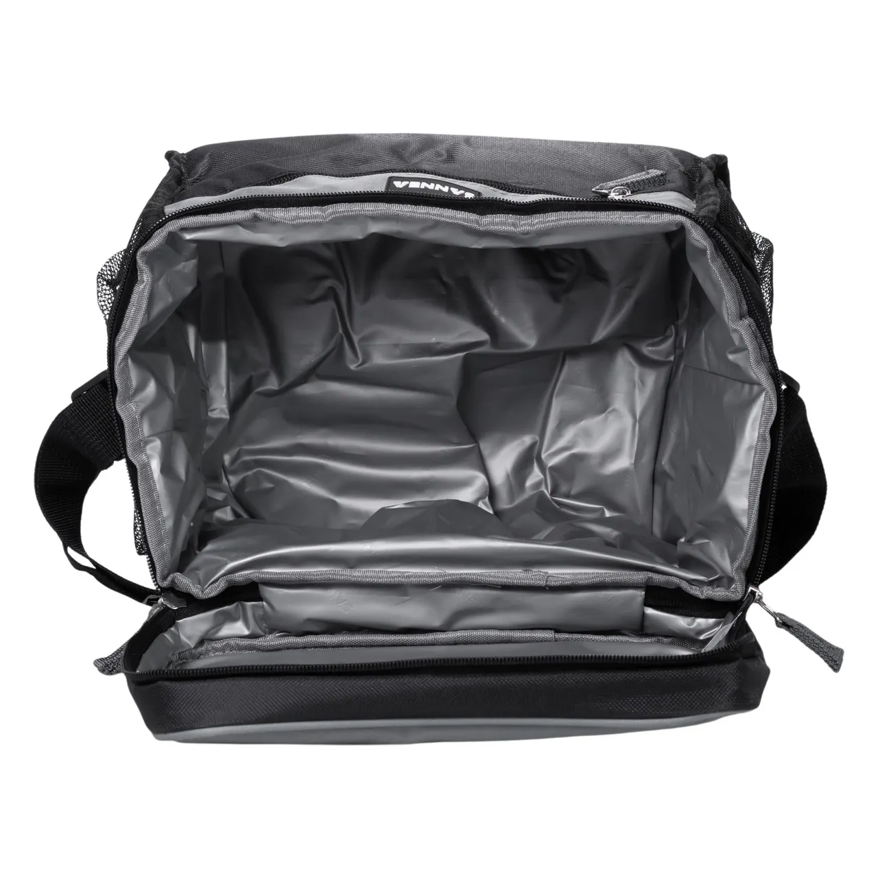 Термосумка оснащена надежной молнией, которой закрывается основное отделение с мягким корпусом. Верхняя крышка открывается полностью, обеспечивая быстрый и простой доступ к содержимому. Для хранения мелких предметов предусмотрен передний карман на молнии, а боковые сетчатые карманы предназначены для дополнительных бутылок или аксессуаров.