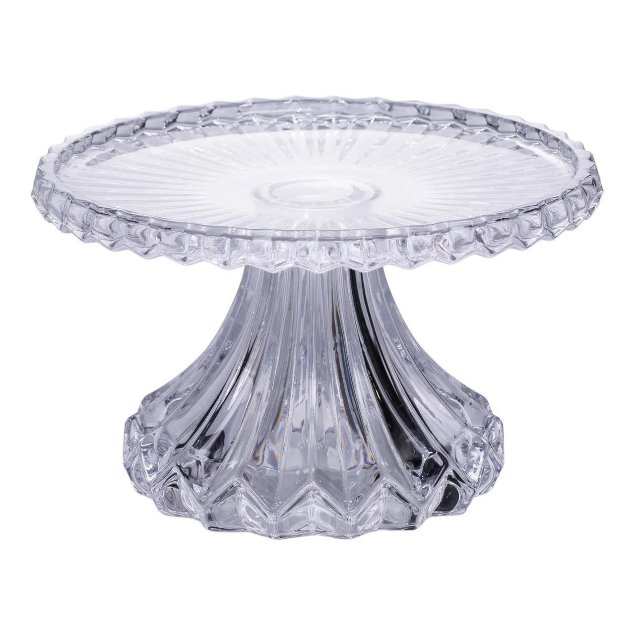 Данная модель выделяется за счет сочетания традиционного круглого дизайна с утонченным рельефным краем и ножкой, повторяющей декоративный узор. Использование прозрачного закаленного стекла с имитацией хрустального эффекта обеспечивает высокую прочность и привлекательный внешний вид, который выгодно подчеркивает красоту десертов.