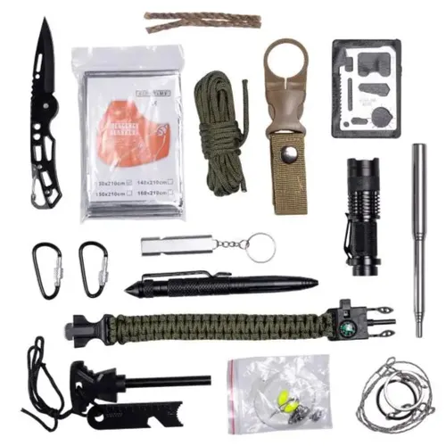 В набор входят разнообразные инструменты, обеспечивающие широкий спектр возможностей для выживания. Среди них спасательное одеяло, которое сохраняет тепло, паракордовый шнур и браслет 6 в 1 с функциями свистка, кресала, компаса и скребка. Также присутствуют тактическая ручка, проволочная пила, нож для выживания, фонарик и набор для розжига костра, включающий сильфон, кресало и огниво с трутом.