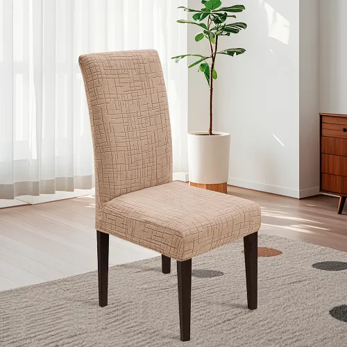 Ткань чехла состоит из 95% полиэстера и 5% спандекса, что обеспечивает оптимальное растяжение и плотное облегание поверхности мебели. Благодаря жаккардовому плетению с эффектом стрейча изделие легко принимает форму стула, обеспечивая аккуратный внешний вид без складок и провисаний.