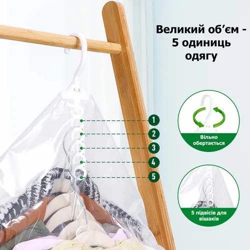 Благодаря встроенной вешалке сохраняется вертикальное положение одежды, что предотвращает появление складок и деформаций, а специальный клапан для удаления воздуха обеспечивает значительное снижение объема вещей, что облегчает их размещение в шкафу или при транспортировке.