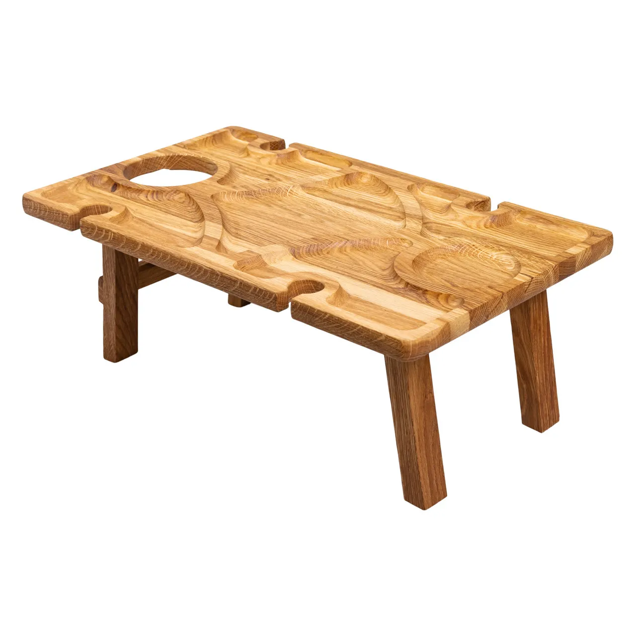 Винный столик-менажница размером 50×30 см — это функциональное изделие из натурального дуба, созданное для комфортной сервировки вина и закусок. Благодаря встроенным углублениям, предназначенным для бутылок, бокалов и разнообразных угощений, столик обеспечивает удобство и организацию пространства во время отдыха как дома, так и на природе.