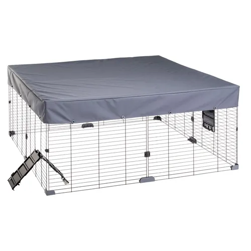 Изготовлен вольер из прочного металлического каркаса с плотной сетчатой обшивкой, которая защищает питомцев от внешних угроз, одновременно обеспечивая хорошую вентиляцию. Основание выполнено из водонепроницаемой и устойчивой к истиранию ткани, что позволяет эффективно удерживать грязь и помет. Эта основа без труда снимается и подходит для машинной стирки, что значительно облегчает уход за изделием и поддержание санитарных условий.