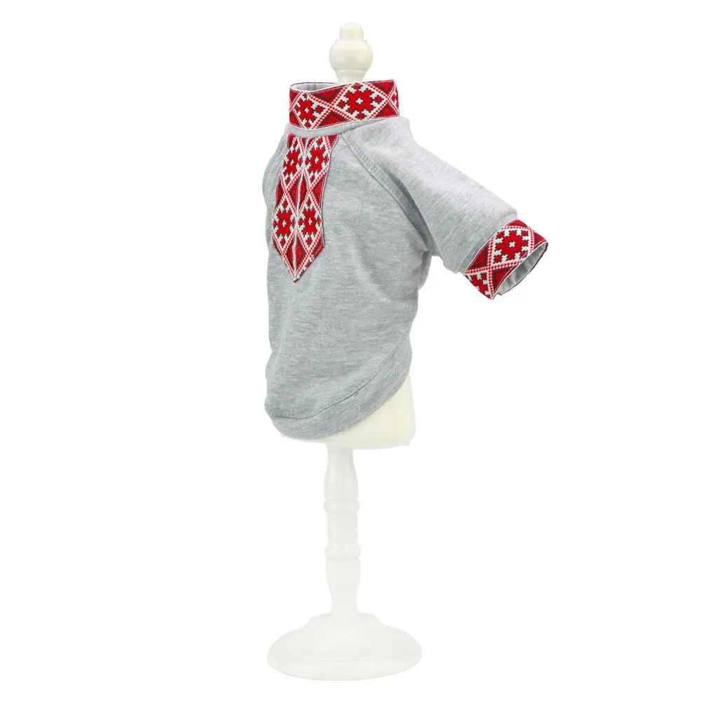 Серая рубашка-вышиванка изготовлена из качественного трикотажа-двонитки, что делает ее легкой, дышащей и удобной для повседневного ношения. Вышитые манжеты и воротник придают изделиям изысканность, а надежные кнопки обеспечивают комфортную фиксацию на теле собаки. Простота надевания и снятия этой рубашки делает её идеальным выбором для активных питомцев.