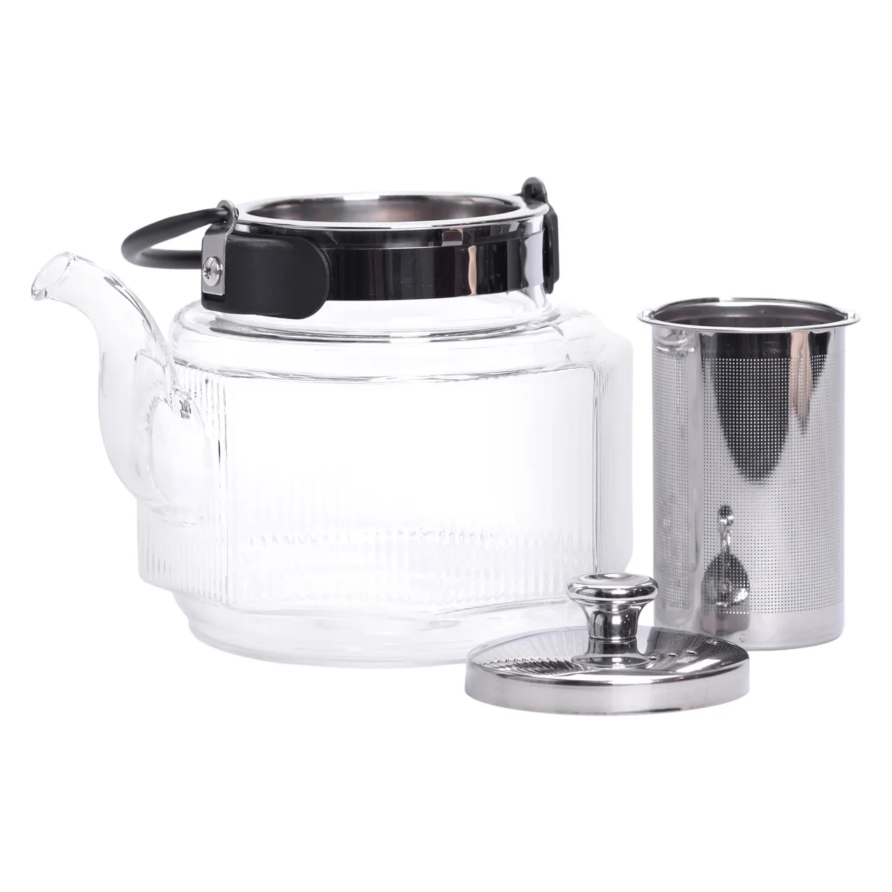 Корпус чайника выполнен из жаропрочного стекла, которое не впитывает запахи и не влияет на оригинальный вкус напитка. Пластиковая крышка и ручка изготовлены из качественного термостойкого пластика, обеспечивающего долговечность и безопасность при контакте с горячей водой. Металлический фильтр дополнительно усиливает эксплуатационные свойства, задерживая частицы чая.