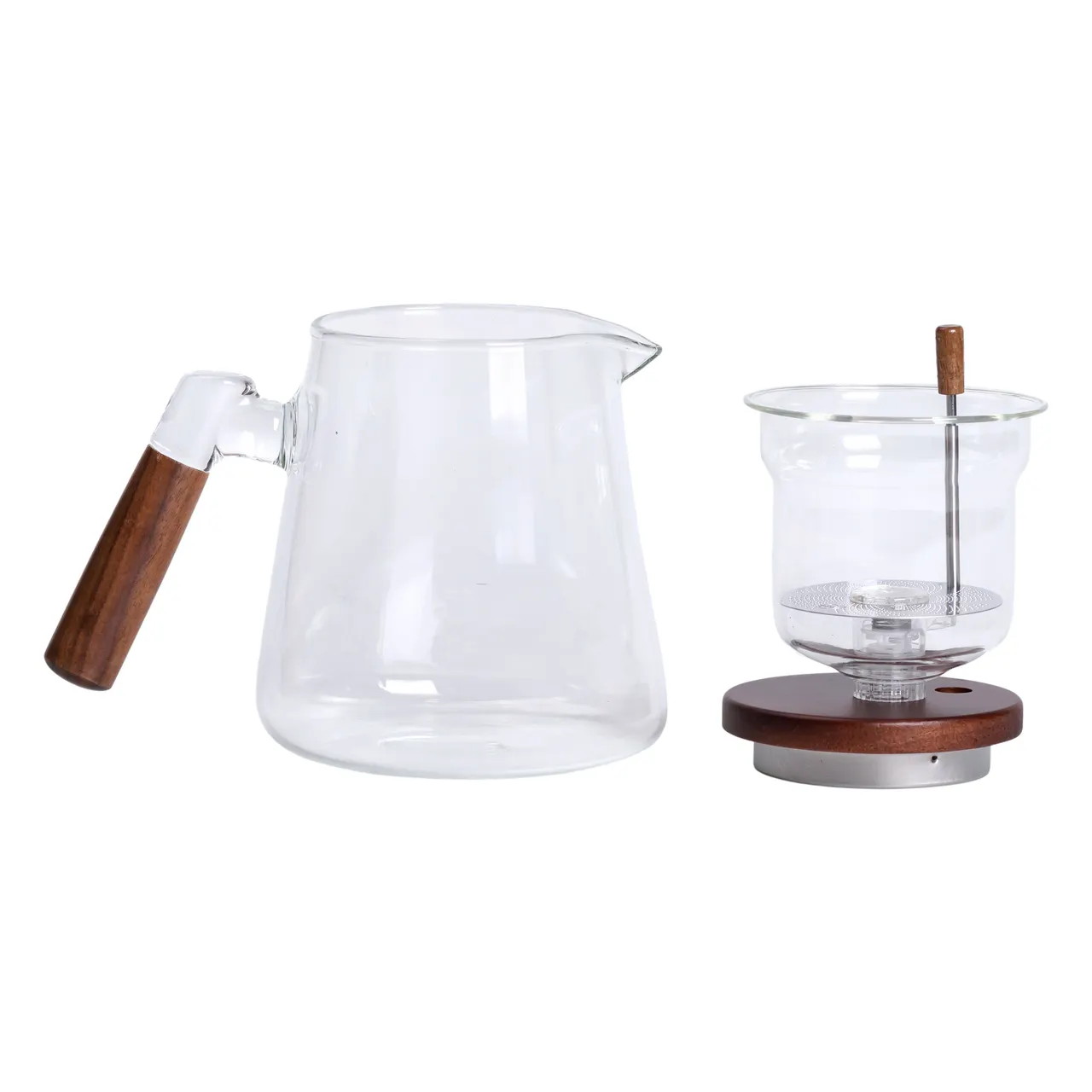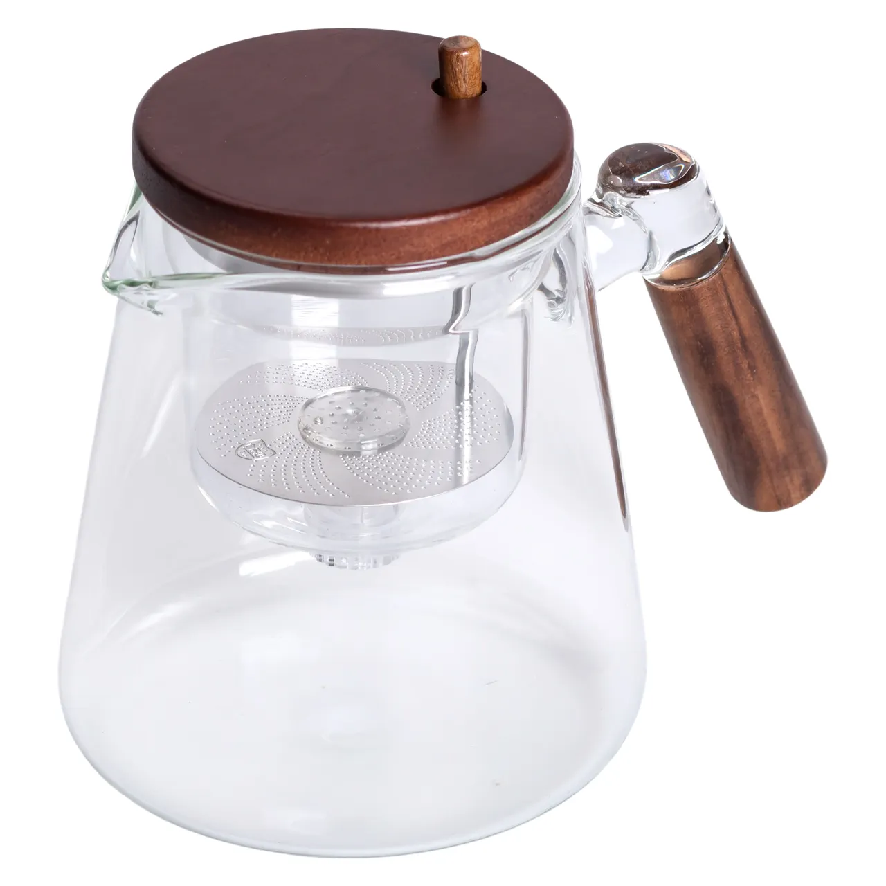 Деревянная эргономичная ручка обеспечивает удобный и безопасный захват, снижая риск ожогов во время подачи горячего чая. Крышка и встроенное ситечко позволяют заваривать чай с листьями, обеспечивая чистую и комфортную подачу без попадания чаинок в чашку.