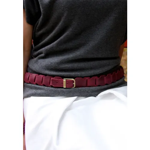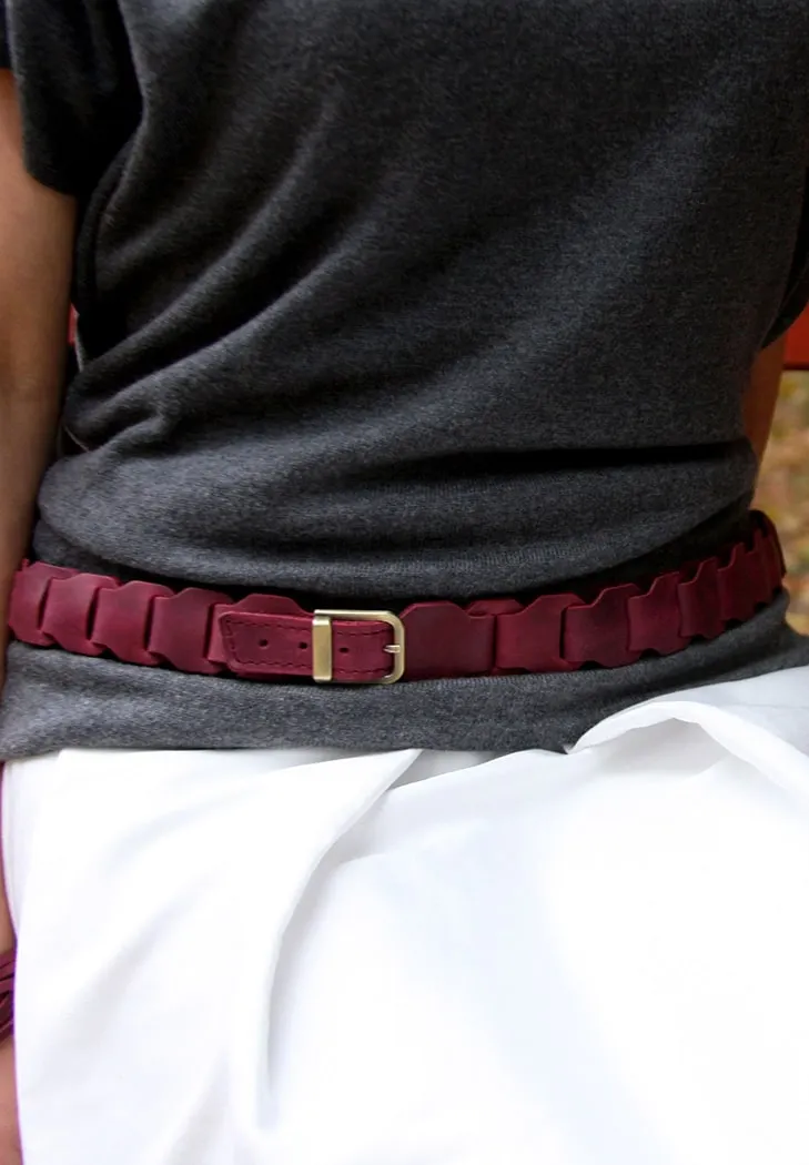 Женский кожаный бохо-пояс бордового цвета подходит для множества ситуаций и стилей. Его используют для подчеркивания талии в свободных платьях, удлиненных рубашках и свитерах, а также придают образу завершенность с джинсами или юбками.