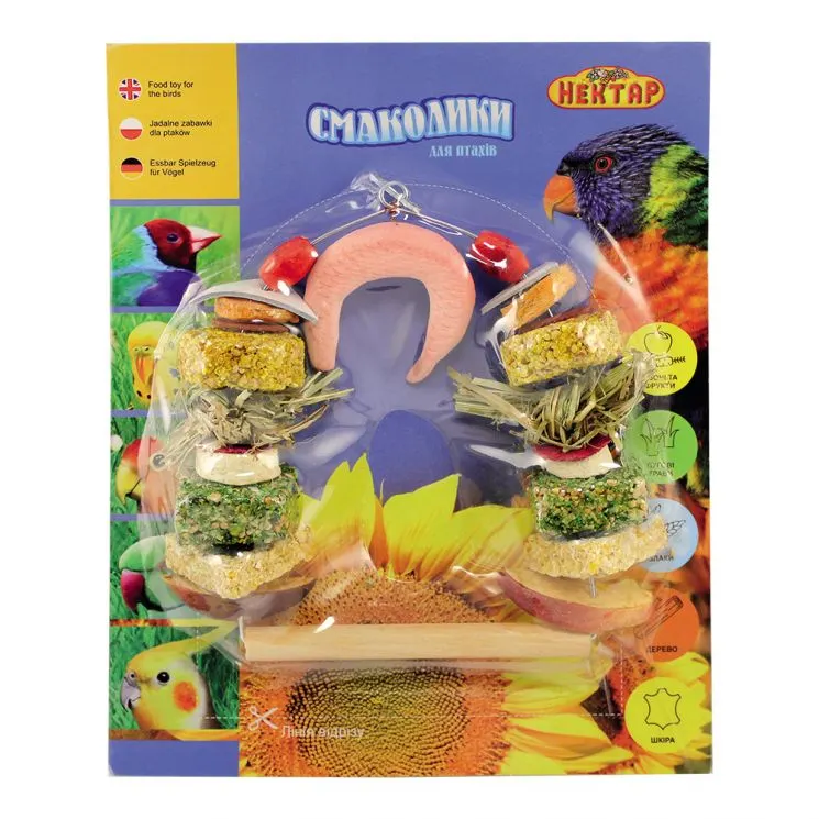 Смаколики для птахів відрізняє висока поживна цінність та можливість тривалого зберігання завдяки унікальній формі упаковки. Птахи отримують повний спектр вітамінів та мінералів, необхідний для їхнього здоров'я. Унікальний склад дозволяє покращити якість та яскравість оперення.