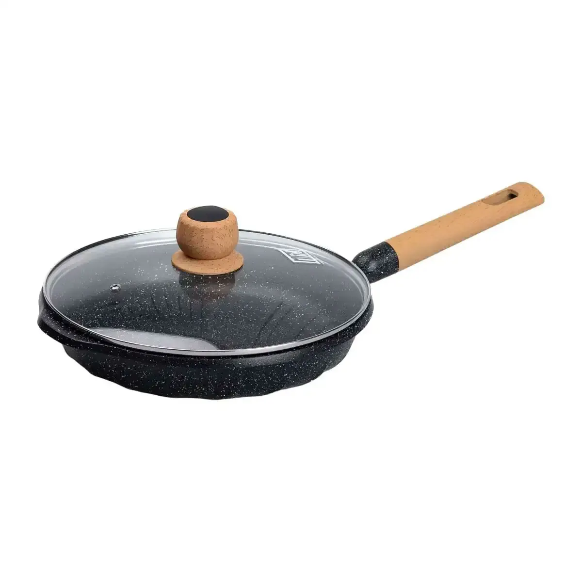 Сковорода з мармуровим покриттям поєднує в собі міцність алюмінію та якісний антипригарний шар, який не містить шкідливих речовин і безпечний для здоров’я. Конструкція з кришкою з жароміцного скла з отвором для пари дозволяє контролювати процес приготування, зберігаючи аромат і структуру страв.