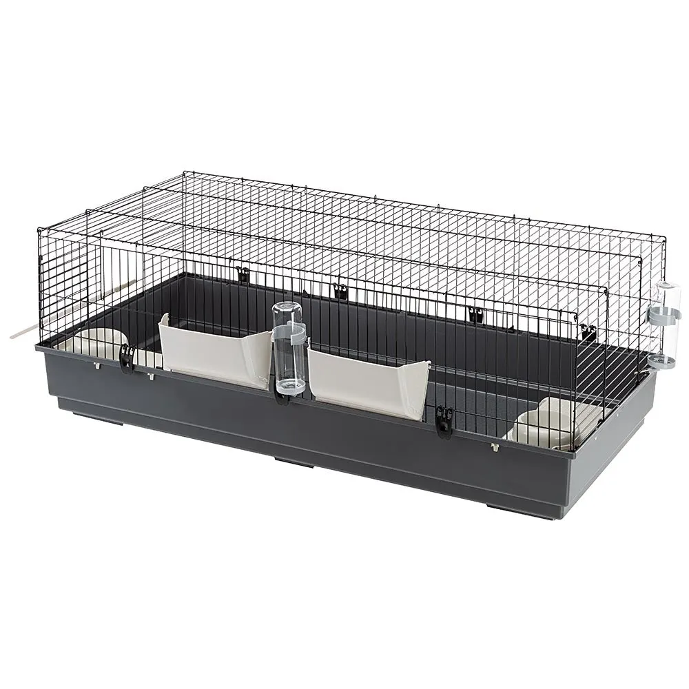 Клітка RABBIT 140 має габарити 140 x 71 x h 51 см і забезпечує просторе та комфортне місце для утримання одного або кількох кроликів. Її конструкція розроблена з урахуванням зручності як тварини, так і власника. У комплект входять важливі аксесуари для повноцінного догляду: дві пластикові годівниці для сіна, дві поїлки та дві миски.