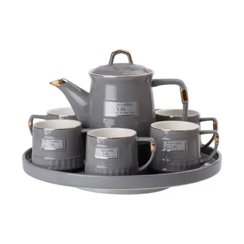 Набір для чаю на 6 осіб включає 8 предметів: 6 чашок об'ємом 300 мл, заварювальний чайник місткістю 1,5 літра та керамічну підставку (піднос). Усі вироби виконані з якісної кераміки в стильному сірому кольорі, що надає набору сучасний та елегантний вигляд. Такий комплект ідеально підходить для чаювань у колі сім’ї або друзів, забезпечуючи комфорт і зручність при сервіруванні.