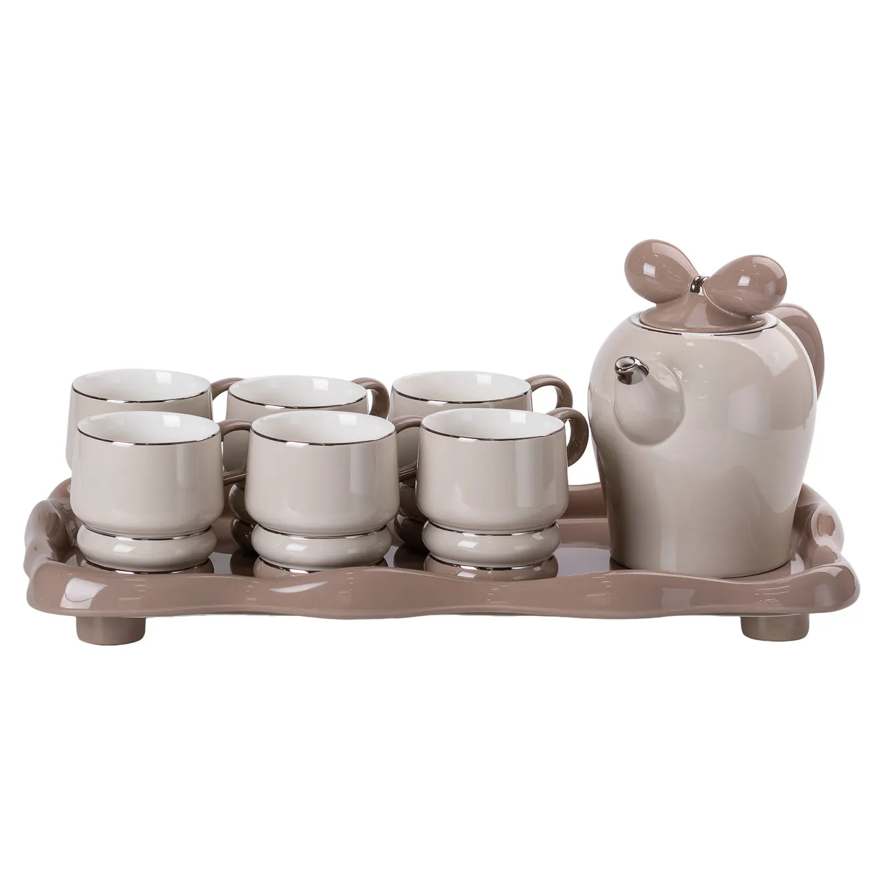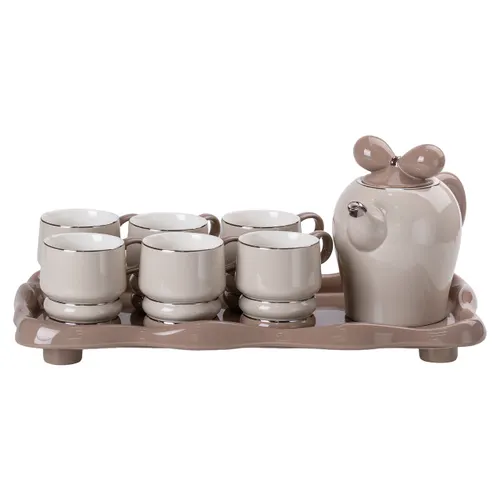 Чайний сервіз на 6 персон із керамічною підставкою — це функціональний і стильний комплект для подавання чаю та інших напоїв під час сімейних або дружніх зустрічей. До складу набору входить чайник об'ємом 1,4 літра, шість чашок по 300 мл та спеціальна підставка з кераміки, яка дозволяє зручно подати чай разом із десертами чи закусками.