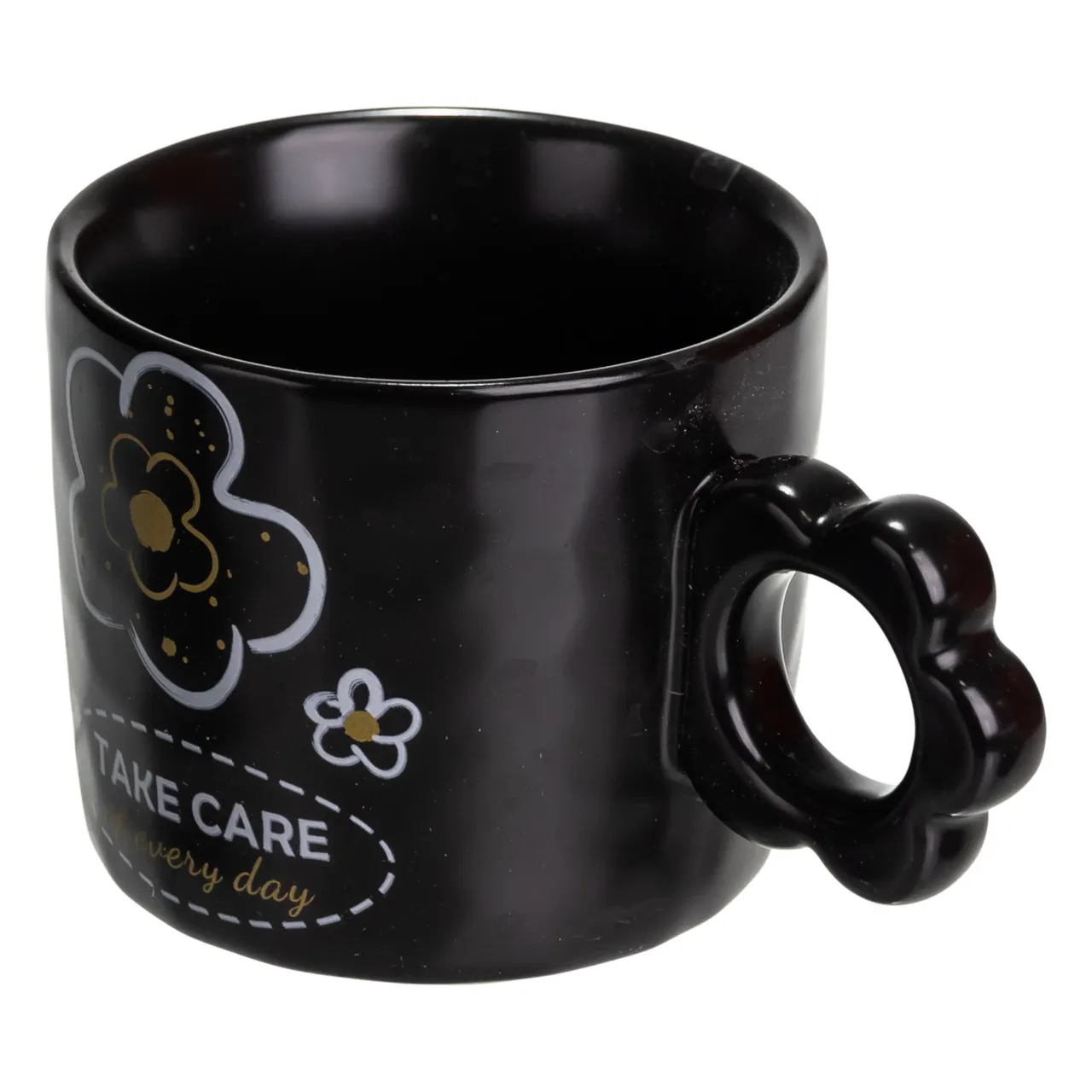 Дизайн чашки виконаний в елегантному чорному кольорі з вишуканим квітковим орнаментом та оригінальною ручкою у формі квітки. Така естетика надає виробу особливу виразність і підходить для тих, хто цінує витончені деталі та комфорт у повсякденному житті.