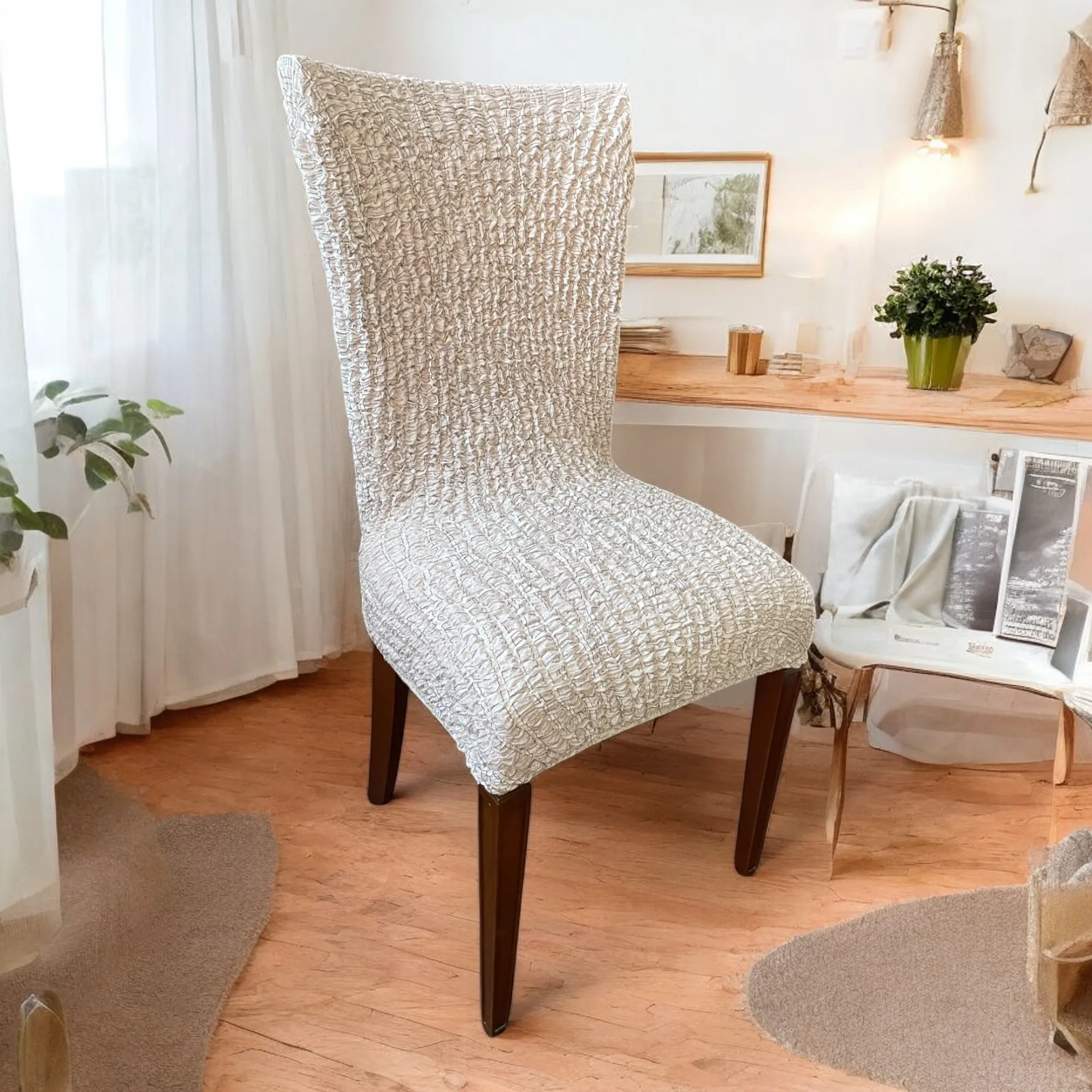 Чохол підходити для стільців зі спинками до 60 см біля висоту, сидіння до 50 см завширшки та 50 см у глібіну, що робити його універсальним вібором для більшості інтер'єрів.
