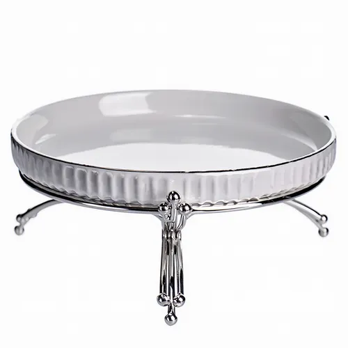 Фарфор — це матеріал, який володіє високою міцністю та стійкістю до пошкоджень, а також не вбирає запахи, що важливо для виробів, що контактують із їжею. Металева підставка виготовлена з якісного матеріалу з покриттям, що запобігає корозії та механічним пошкодженням.