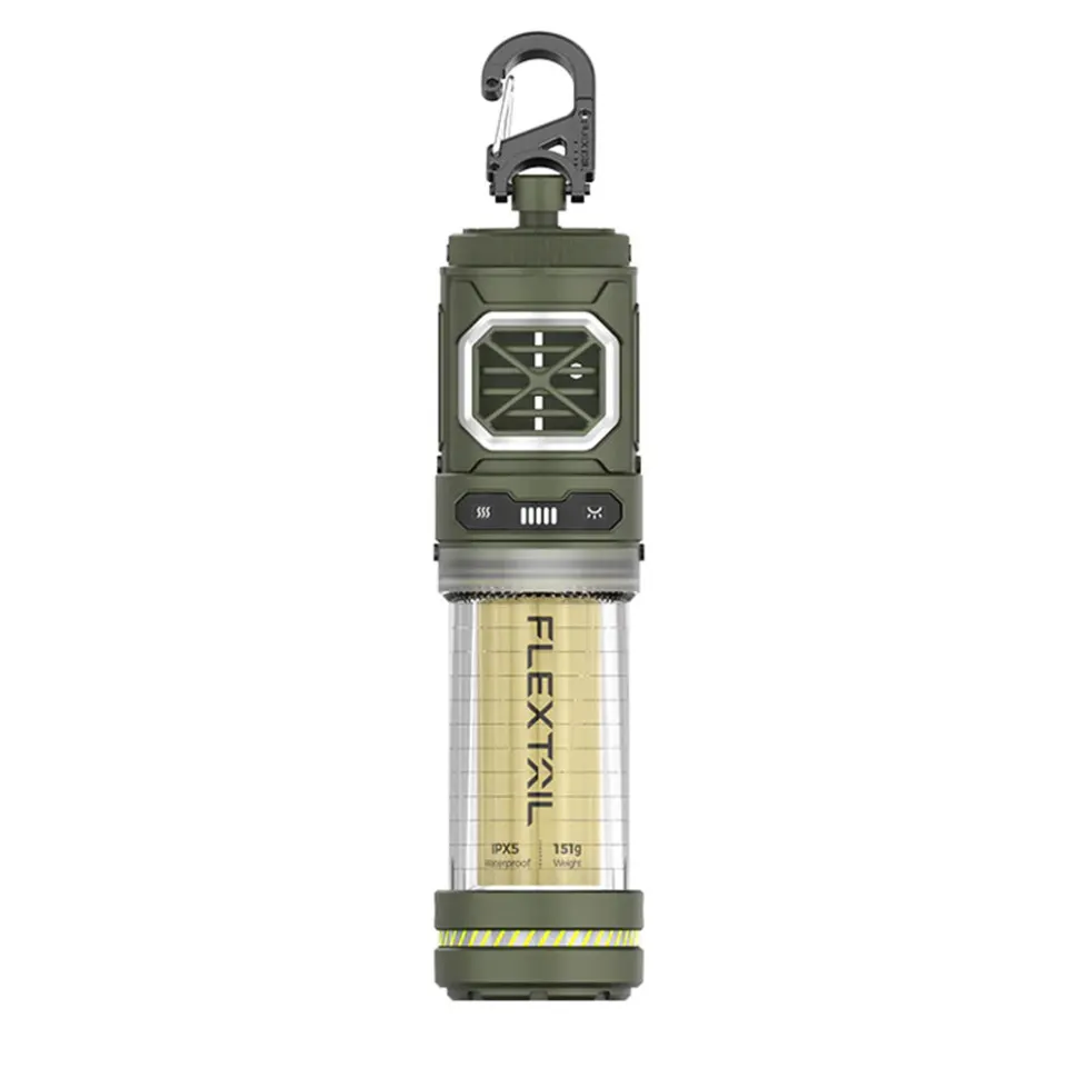Фумігатор-ліхтар Flextail живиться від вбудованого акумулятора (17,5 Вт·год) з зарядним портом USB-C і підходить для експлуатації в різних погодних умовах. Герметичність корпуса відповідно до стандарту IPX5 гарантує захист внутрішньої електроніки від вологи у випадку потрапляння конструкції під струмінь води з будь-якого напрямку.