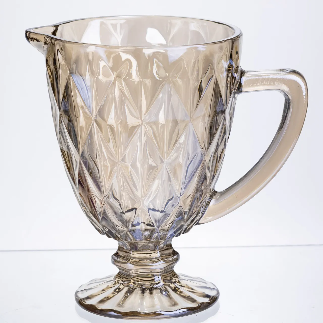 Елегантний декоративний глечик об'ємом 1 літр у вінтажному стилі. Глек поєднує практичність та естетичний дизайн. Відмінний подарунок та елемент святкового сервірування. Особливості: Дизайн: рельєфний геометричний візерунок створює гру світла та глибини. Універсальність: підходить для сервірування води, лимонаду, морсів, а також декоративний елемент для свят та інтер'єру. Догляд: рекомендовано мити вручну, не використовувати абразивні засоби. Характеристики: Матеріал: скло Об'єм: 1 л Розміри (діаметр/висота): 13/19,3 см Вага: 600 г