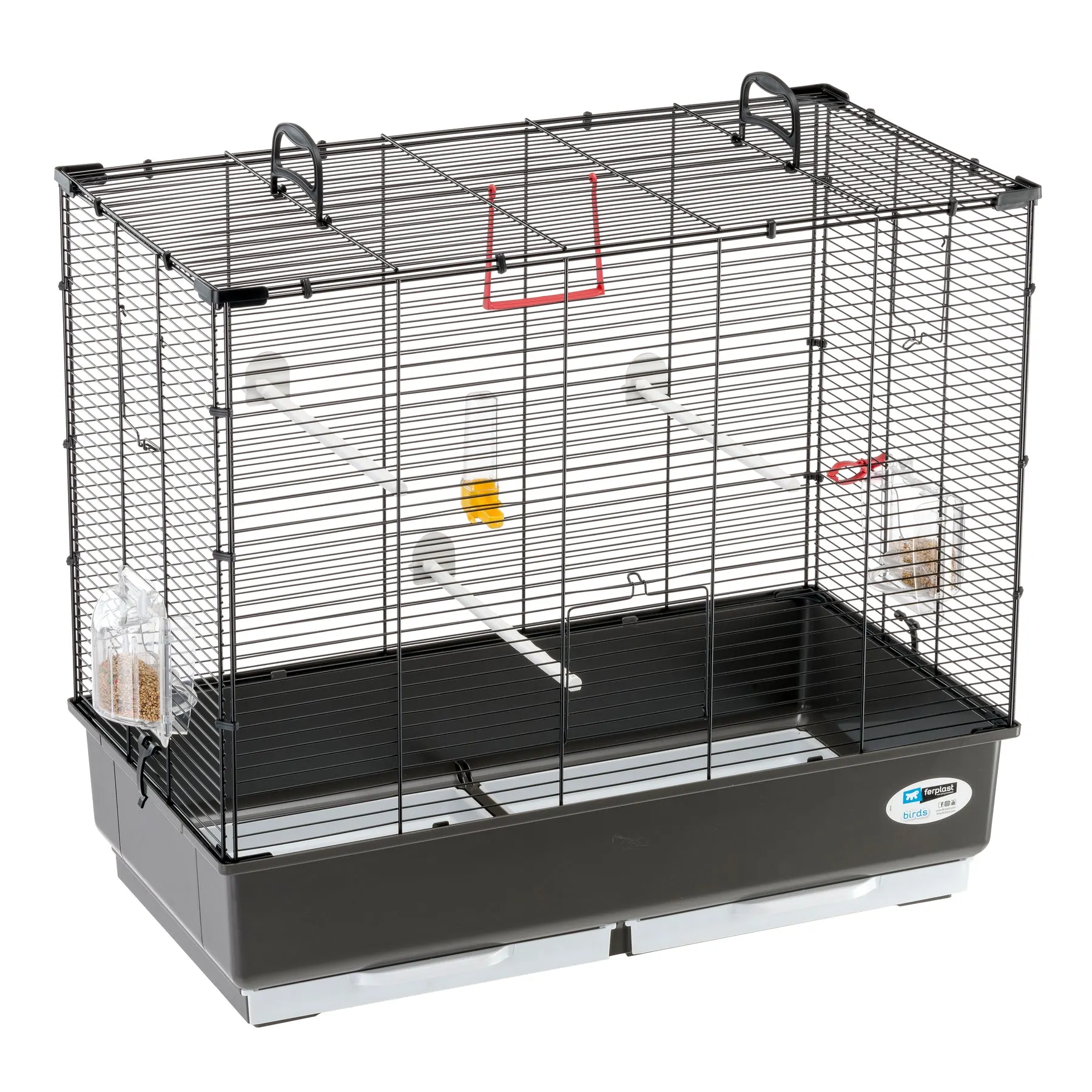 Пластиковий піддон оснащено двома знімними висувними підносами, що значно полегшує процес прибирання і допомагає підтримувати гігієну середовища проживання птахів. Комплект доповнений важливими аксесуарами: пластиковими жердочками, поїлкою, затискачем для овочів та гойдальцем, що створюють комфортні умови та розваги для пернатих.