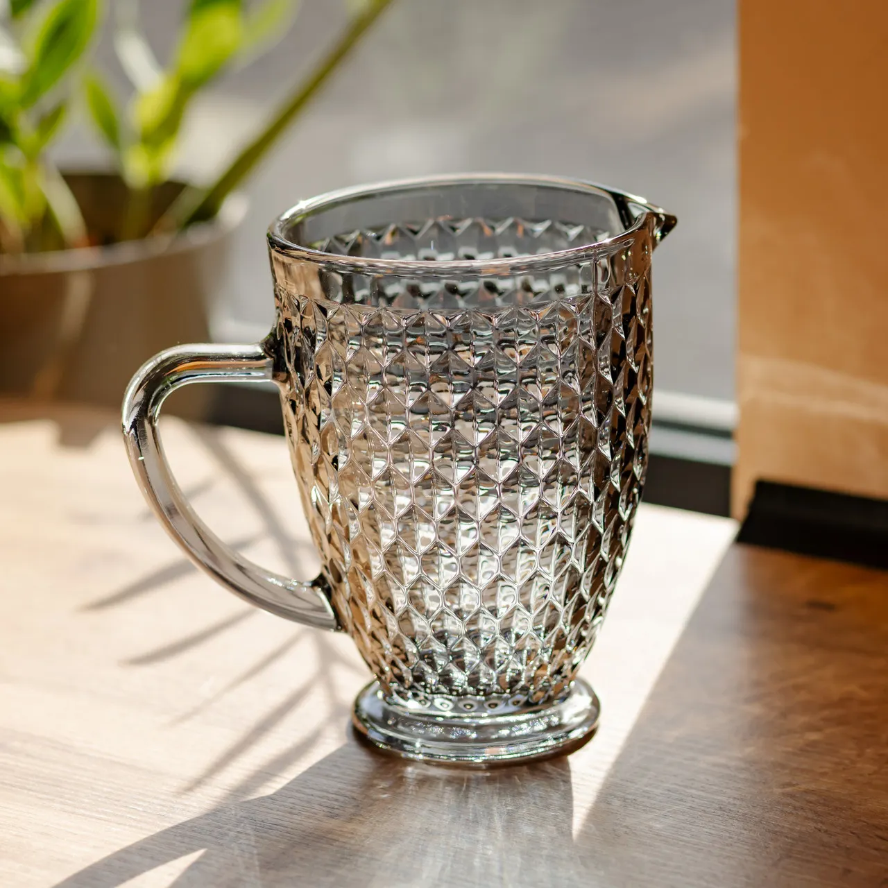 Глечик для напоїв об’ємом 1.2 л виготовлений із товстого скла. Він має декоративну поверхню з рельєфними вигинами у формі ромбів. Такий дизайн додає візуального об'єму та сприяє грі світла на склі, що особливо помітно при сервіруванні напоїв. Прозоре скло дозволяє бачити вміст, а товсті стінки забезпечують міцність. Форма глечика продумана для зручного наливання — виріб має зливний носик і суцільнолиту скляну ручку, яка зручно лежить у руці. Глечик займає мінімум місця на столі або в холодильнику. Матеріал не вбирає запахів і легко очищується. Глечик призначений для подавання води, соків, лимонадів та інших прохолодних напоїв. Його можна використовувати як у повсякденному побуті, так і для сервірування під час свят. Рекомендовано ручне миття або делікатний режим у посудомийній машині без абразивних мийних засобів. Характеристики: Об’єм: 1.2 л Матеріал: скло Висота: 18.5 см Діаметр: 12 см