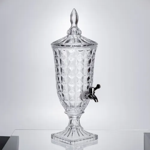 Лимонадниця з краном на підставці скляна об'ємом 2 літри представляє собою практичний і стильний аксесуар для подачі прохолодних напоїв. Висота виробу становить 46 см, що забезпечує достатню місткість при компактних габаритах, зручних для розміщення на столі будь-якої поверхні. Завдяки прозорому склу з вертикальним ребренням, лимонадниця виглядає вишукано і підходить для різних заходів, будь то святковий стіл, фуршет або щоденне використання вдома.