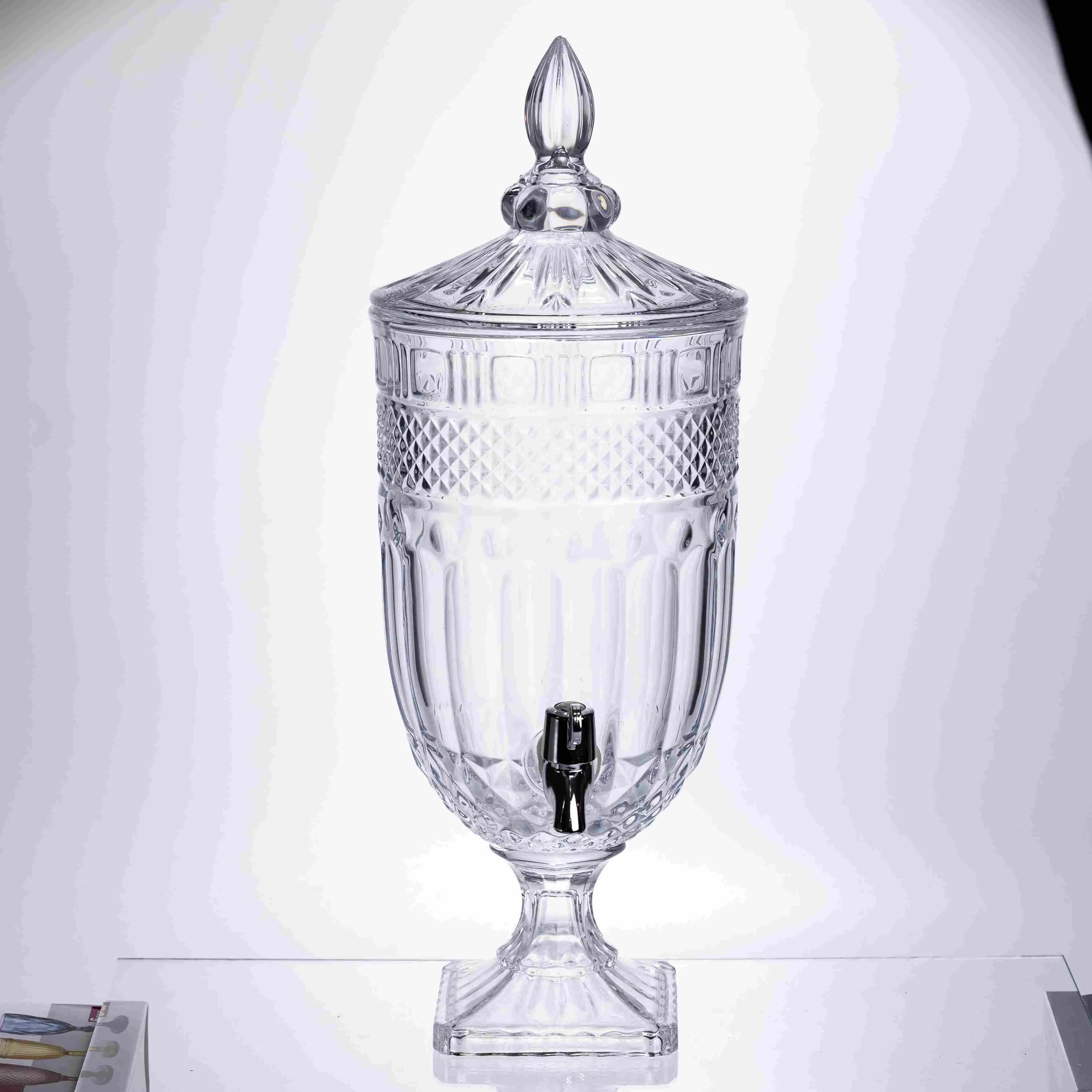 Масивний диспенсер для подачі прохолодних напоїв на великих заходах. Завдяки класичному рельєфному візерунку та об'єму, він стає центральним елементом сервірування, поєднуючи в собі естетику антикварного скла та сучасну практичність. Особливості: Багатий орнамент: Корпус прикрашений складним багаторівневим огранюванням — від вертикальних ліній у нижній частині до тонкої ромбоподібної сітки та квадратних розеток зверху. Максимальна місткість: Об'єм 5 літрів ідеальний для тривалих урочистостей, весіль або великих сімейних свят, позбавляючи необхідності часто доливати напій. Кришталева прозорість: Чисте скло без відтінків дозволяє ефектно презентувати складні напої з великою кількістю льоду, ягід та фруктів. Стійка ніжка: Диспенсер міцно стоїть на широкій квадратній основі, що критично важливо для посуду такого об'єму та ваги. Комплектація: Масивна скляна кришка з гострим навершшям надійно захищає вміст від зовнішнього середовища. Характеристики: Матеріал: скло Об'єм: 5 л Діаметр: 19 см Висота: 52 см Матеріал краника: пластик Вага: 5,1 кг