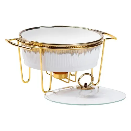 Металева підставка з нержавіючої сталі забезпечує надійне розміщення марміта і зручність при подачі страв. Кришка зі скла з можливістю знімання дозволяє контролювати процес розігріву та полегшує доступ до вмісту без втрати тепла.