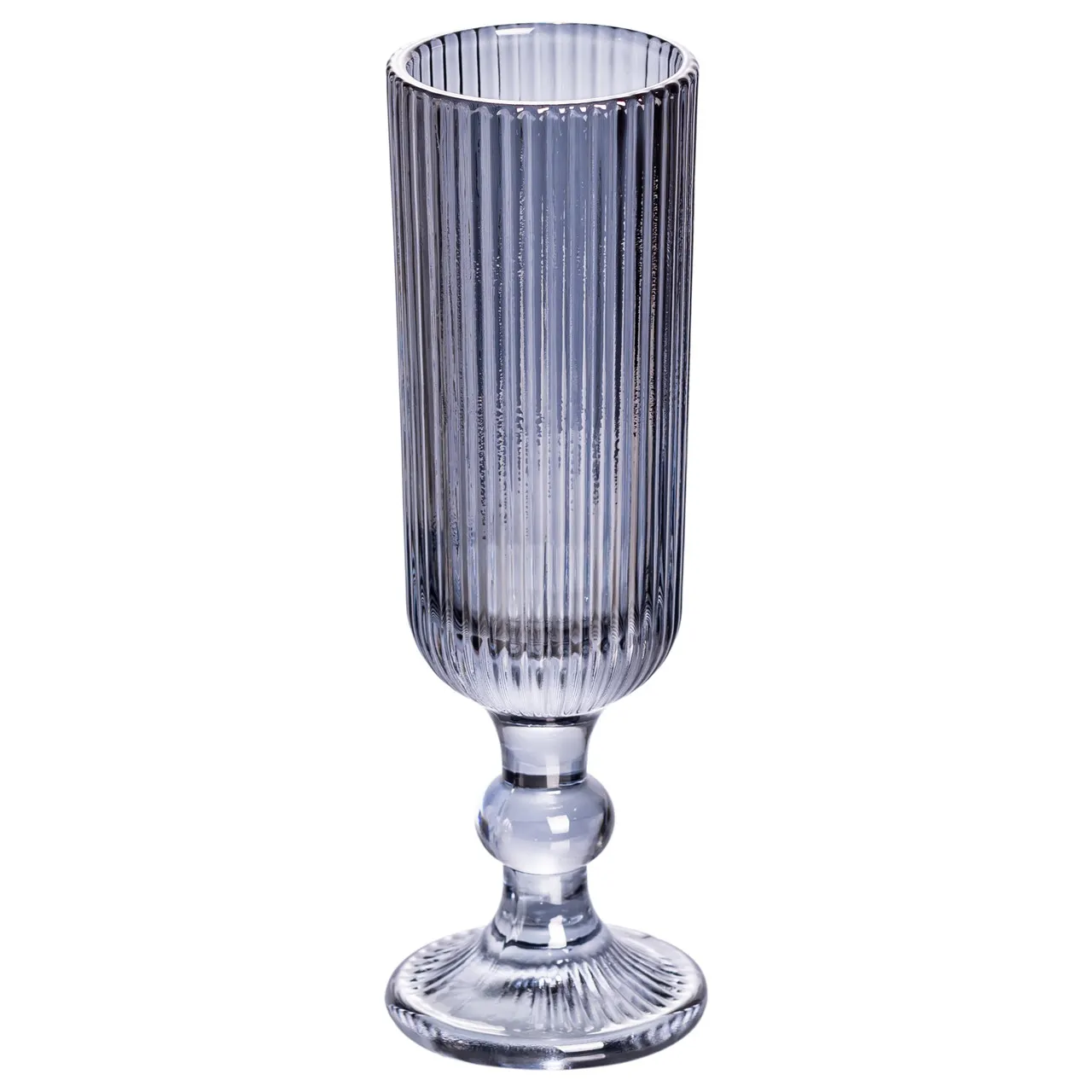 Набір келихів для шампанського з 6 штук об'ємом 160 мл являє собою стильні подарункові скляні келихи на високій ніжці, виконані в сірому кольорі. Кожен келих виготовлений з міцного товстого скла з рельєфною поверхнею, прикрашеною вертикальним ребристим візерунком. Така текстура не лише надає келихам виразного та елегантного вигляду, а й покращує зручність утримання, знижуючи ризик вислизання з руки.