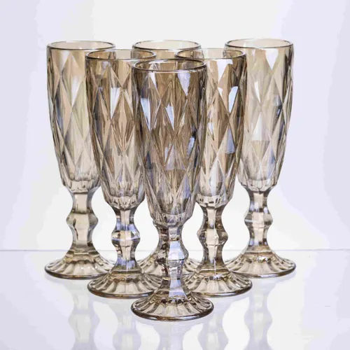 Елегантний комплект келихів із тонованого скла в теплому бурштиновому відтінку. Висока чаша типу «флюте» та класичне алмазне огранювання створюють розкішну гру світла, роблячи їх ідеальним вибором для святкового сервірування. Особливості: Бурштиновий відтінок: Теплий золотисто-медовий колір скла надає сервіруванню затишку та створює відчуття свята, особливо при природному освітленні. Алмазна грань: Рельєфний геометричний візерунок не тільки естетичний, а й практичний - келих надійно лежить у руці і не вислизає. Витончена форма: Висока струнка чаша на тонкій фігурній ніжці ідеально підходить для подачі шампанського, ігристих вин та легких коктейлів. Характеристики Матеріал: скло Об'єм: 180 мл Висота: 19,3 см Вага: 2 кг