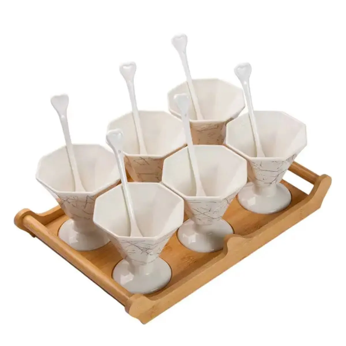 Кожна креманка обладнана зручною ніжкою, яка не лише прикрашає виріб, а й забезпечує комфортне використання при подачі та споживанні десертів. Набір доповнений дерев’яною підставкою, що робить його зручним для транспортування та сервірування столу.