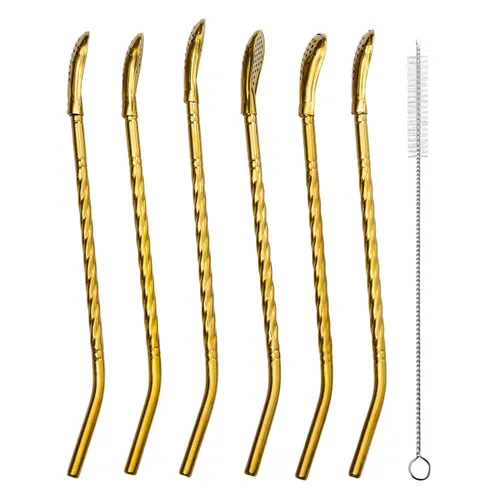 Набір багаторазових ложок-трубочок 6 шт для напоїв 19.5 см з щіткою Золотистий HP-20-56 є поєднанням функціональності та стилю. Кожна ложка оснащена трубочкою, що забезпечує можливість як перемішувати напої, так і пити їх безпосередньо через трубочку. Це робить комплект особливо зручним для різних напоїв, включаючи соки з м'якоттю, коктейлі, чай, смузі та інші холодні й теплі напої.