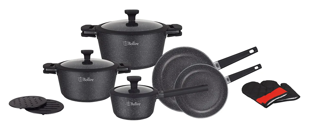 Випереджаючи своїх конкурентів за всіма показниками, посуд Bollire з мармуровим покриттям в 3 рази кращий у плані антипригарних властивостей, на 50% стійкіший до подряпин і в 2 рази міцніший за аналоги. Має литу алюмінієву основу у поєднанні з екологічно чистим та довговічним мармуровим покриттям усередині. Швидке нагрівання та утримання тепла дозволяє економити енергію, при цьому забезпечуючи ефективне та тривале використання. Чудові характеристики теплопровідності, збереження смаку та поживних речовин – все це дозволяє готувати чудові страви з неймовірним смаком та ароматом.