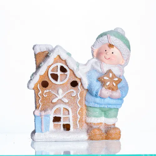 Фігурка виконана з особливою увагою до деталей: дитина у в'язаному голубому светрі та м’ятно-зелених штанях, білому шарфі та коричневих чобітках тримає в руках зірку, що нагадує імбирне печиво з глазур’ю. Поруч стоїть пряниковий будиночок із білою «глазур’ю», що створює ефект снігового покриву, і голубий подарунок біля основи, наповнюючи композицію додатковим символізмом свята.