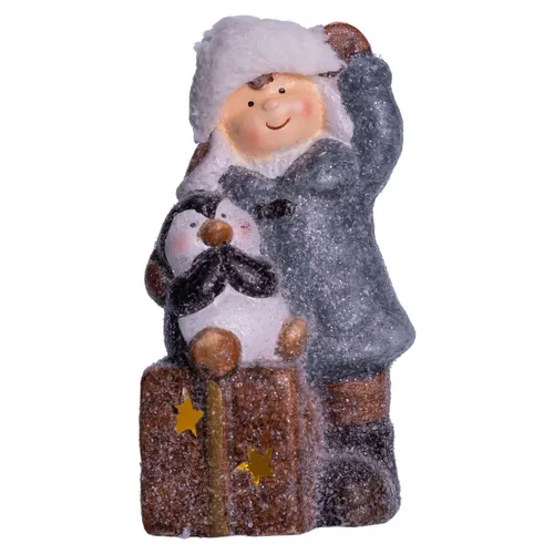 Новорічна декоративна фігурка з підсвіткою розміром 9×10×19 см є акуратно виконаним елементом святкового інтер'єру. Виготовлена з високоякісного фарфору, вона відрізняється міцністю та естетичною привабливістю. Фігурка виконана у образі дівчинки з подарунком, що символізує тепло, добро та святковий настрій.