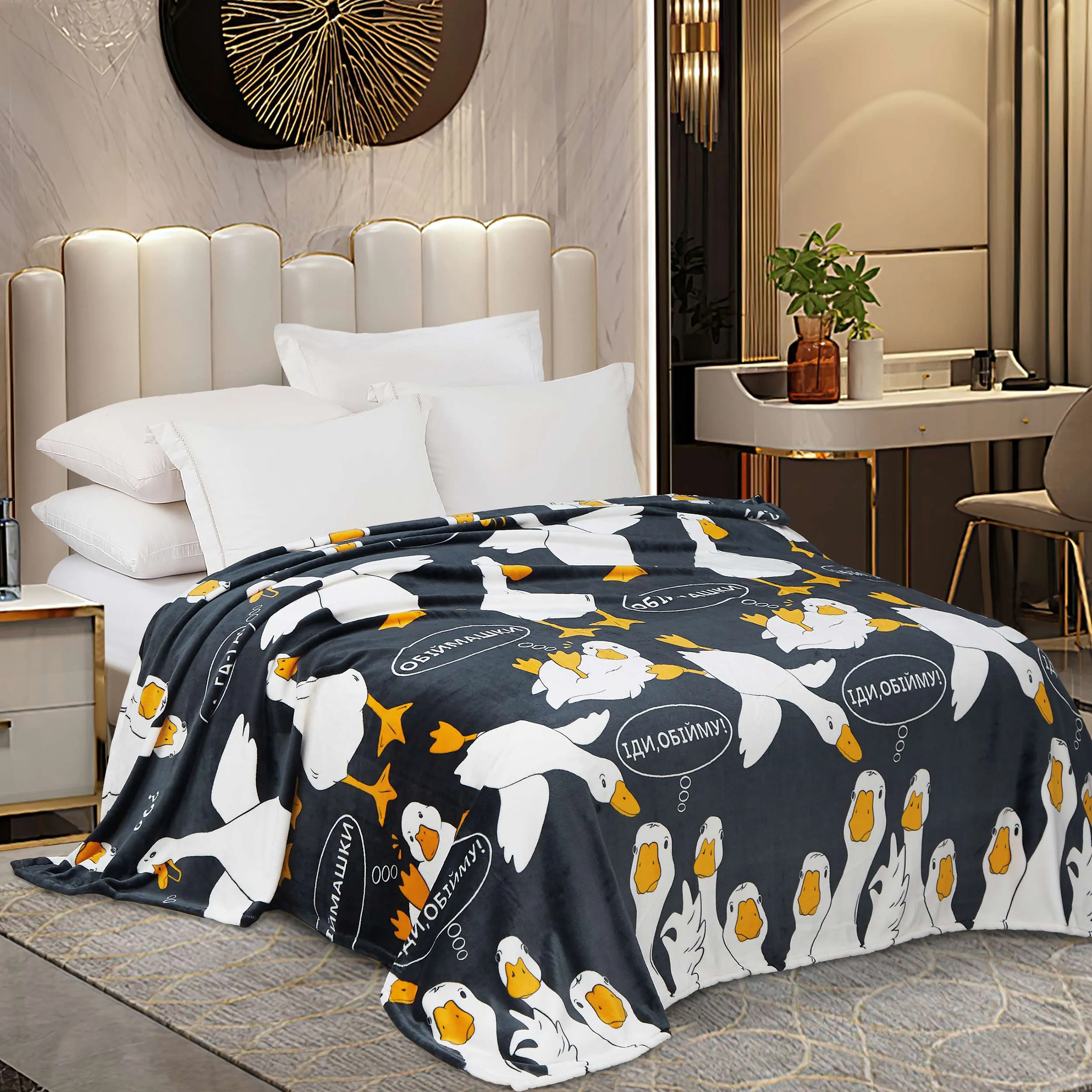 Крім того, плед можна використовувати як декор в інтер'єрі. Стильні принти гусей додадуть яскравості та затишку будь-якому приміщенню, наголошуючи на індивідуальності вашого стилю.