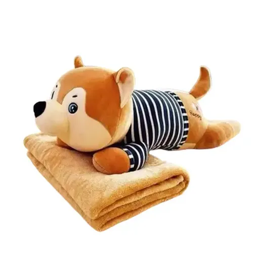 Іграшка виготовлена з м’якого плюшевого матеріалу, приємного на дотик, а плед виготовлений з високоякісного коралового флісу, який володіє відмінними теплоізоляційними властивостями. Обидві частини поєднуються між собою завдяки застібці-блискавці, розташованій на животі собаки, що забезпечує легке та зручне використання.