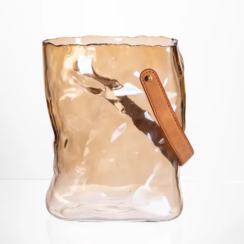 Ця ваза поєднує у собі функціональність та оригінальний дизайн. Нерівна структура скла створює ефект гри світла і надає виробу глибину, роблячи його помітним елементом інтер'єру. Шкіряна ручка не лише прикрашає вазу, але й дозволяє легко переносити її, що зручно при зміні обстановки або прикрашанні різних зон.