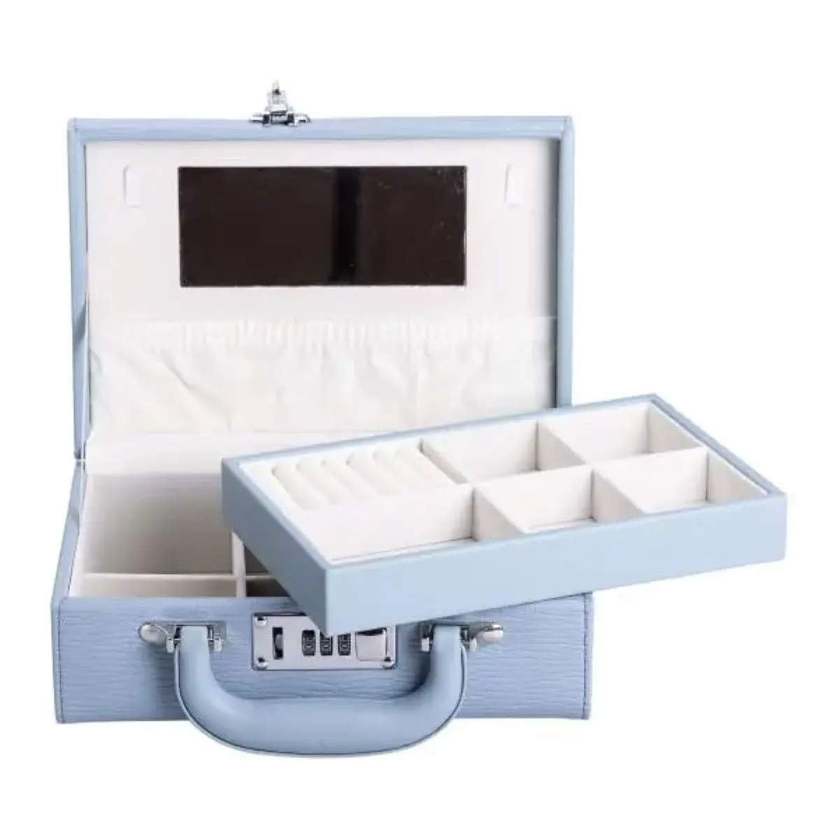Шкатулка для прикрас з еко-шкіри з двома ярусами та кодовим замком — надійний і функціональний аксесуар для зберігання різноманітних ювелірних виробів. Висока якість матеріалів, практичний дизайн і безпека забезпечують зручність використання і захист ваших прикрас.