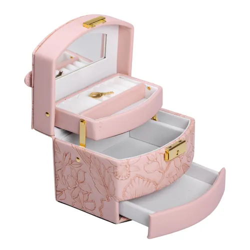 Шкатулка оснащена трьома ярусами та чотирма окремими відсіками, що забезпечує зручну систематизацію ювелірних виробів. Це дозволяє уникнути сплутування ланцюжків і забезпечує швидкий доступ до будь-якої прикраси.