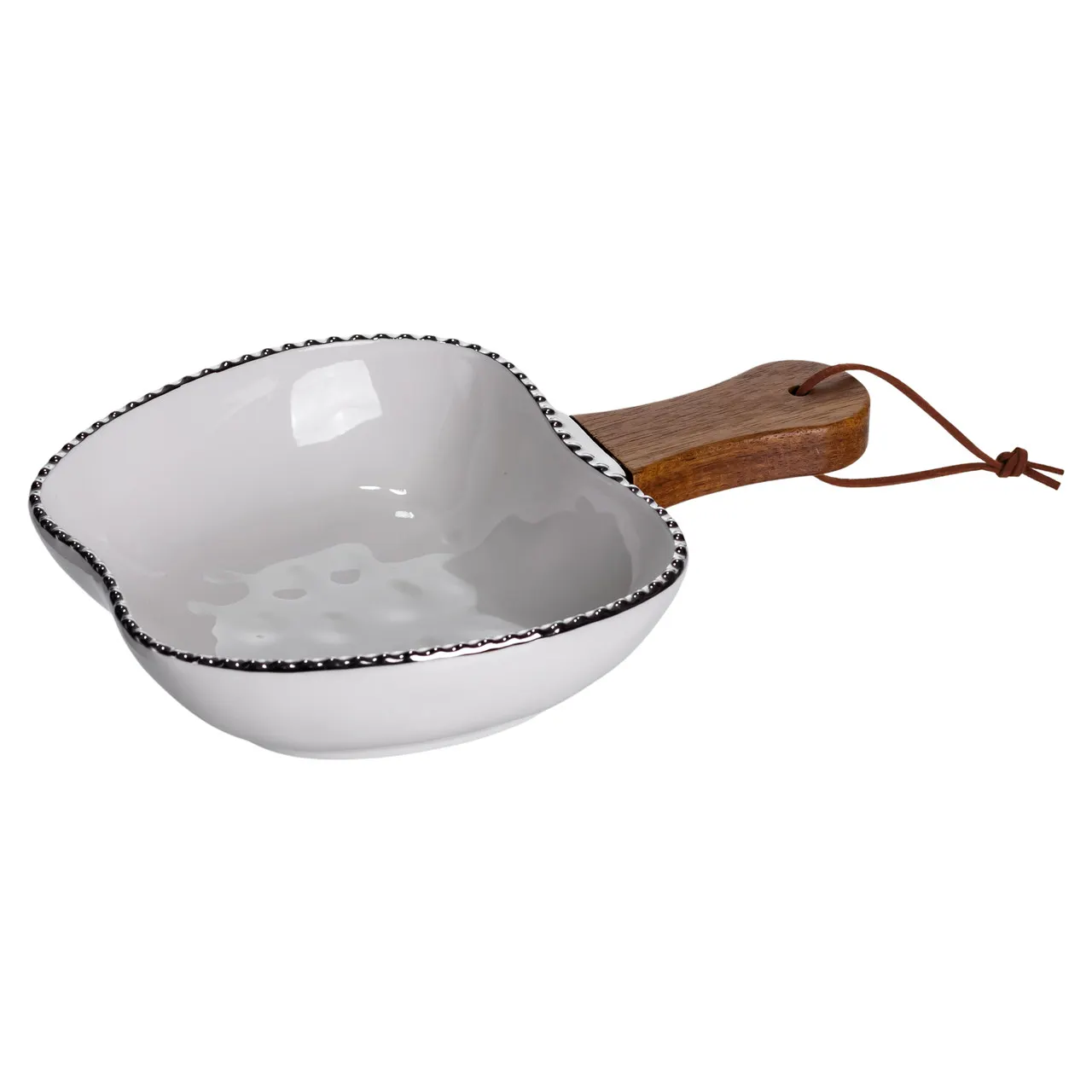 Тарілка порцелянова глибока з ручкою "Яблуко" розміром 23×16×4 см представляє собою оригінальну сервірувальну страву, виконану з високоякісної порцеляни. Завдяки використанню міцних і екологічних матеріалів, виріб відрізняється надійністю та довговічністю. Порцеляна забезпечує гігієнічність і стійкість до високих температур, а зручна дерев'яна ручка сприяє комфортному використанню без ризику опіків.